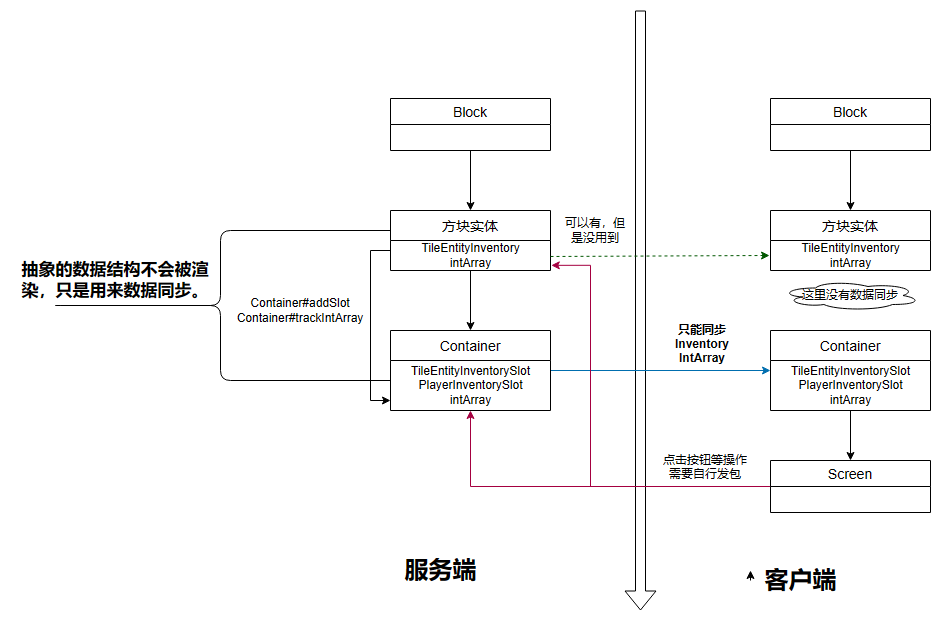 通过这张图你应该明白客户端额数据仅仅用于展示的,所以你不要更改这些数据,如果要实现一些按钮点击的操作,请采用发包的方法解决,对于menu也就是图里面的container是可以自己同步slot的数据和containerdata的这部分不需要你处理。