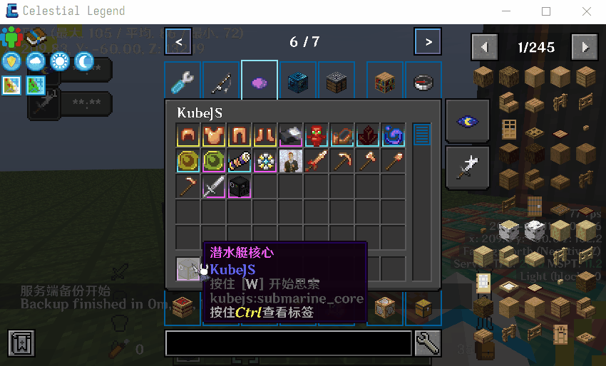 因为在本篇教程的同时我也在制作, 图中的紫黑色方块是我使用KubeJS注册的一个新方块.由于录制的时间不同, 紫黑色是还未有贴图的时候, Minecraft 自身的规则是没有贴图会自动渲染成紫黑色的方块, 后面有了贴图自然也就不一样了